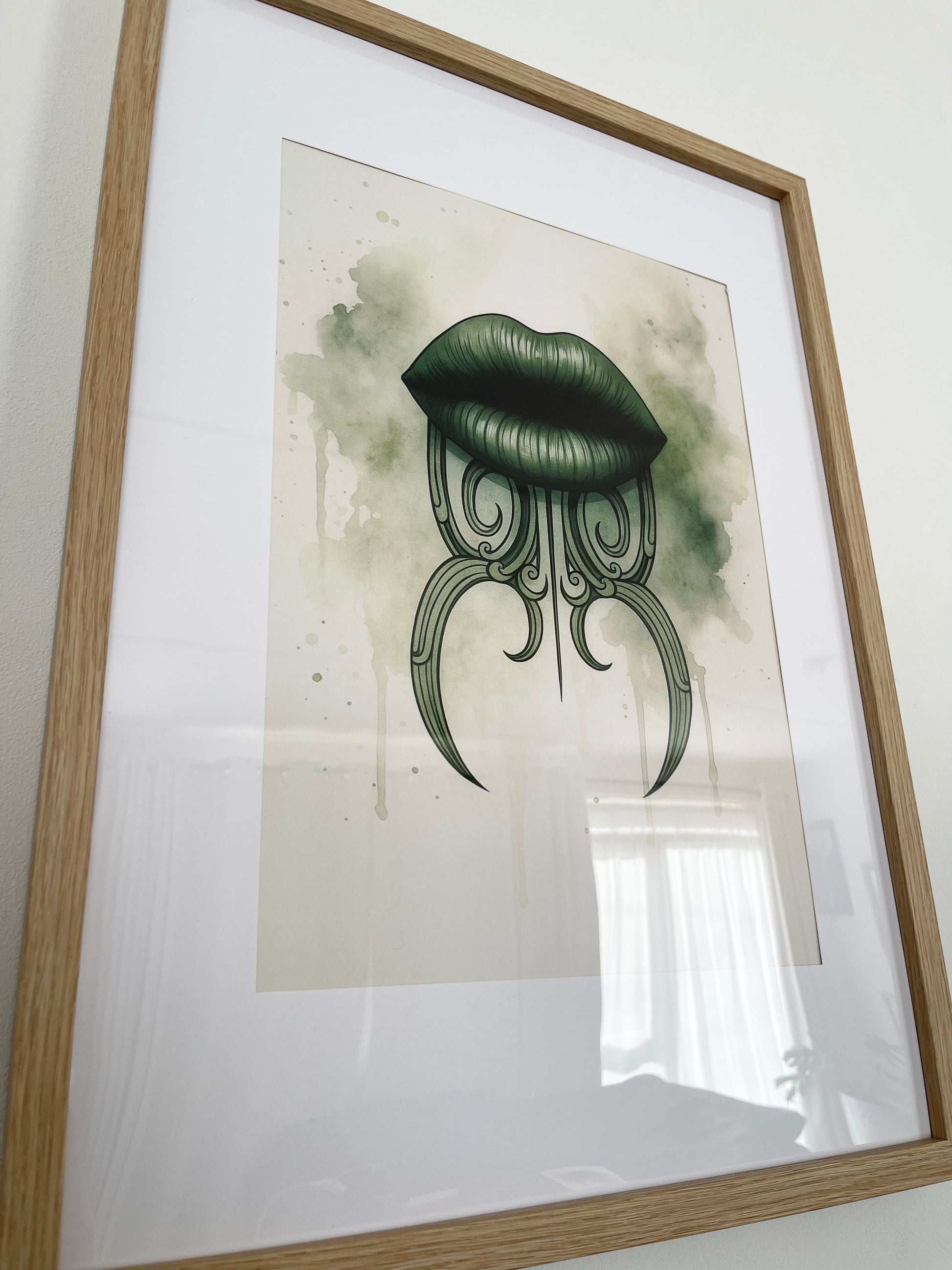 Bring cultural beauty and strength into your home with this striking Green Moko Kauae art print. Featuring richly detailed lips in warm green tones, the piece is accentuated with intricate moko kauae design work that honours Māori tradition. The soft watercolor splashes in the background create depth and warmth, giving the artwork a modern yet timeless feel.